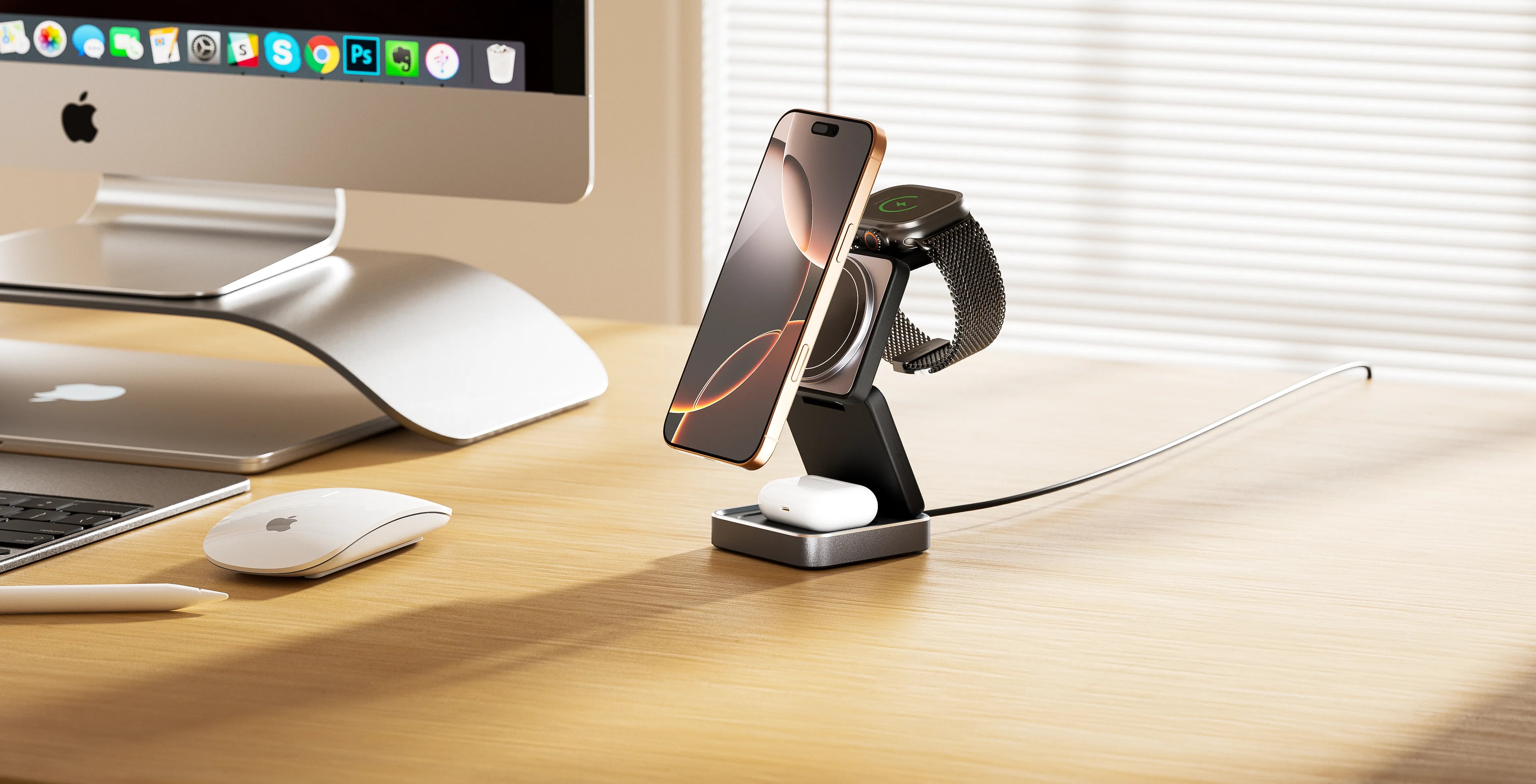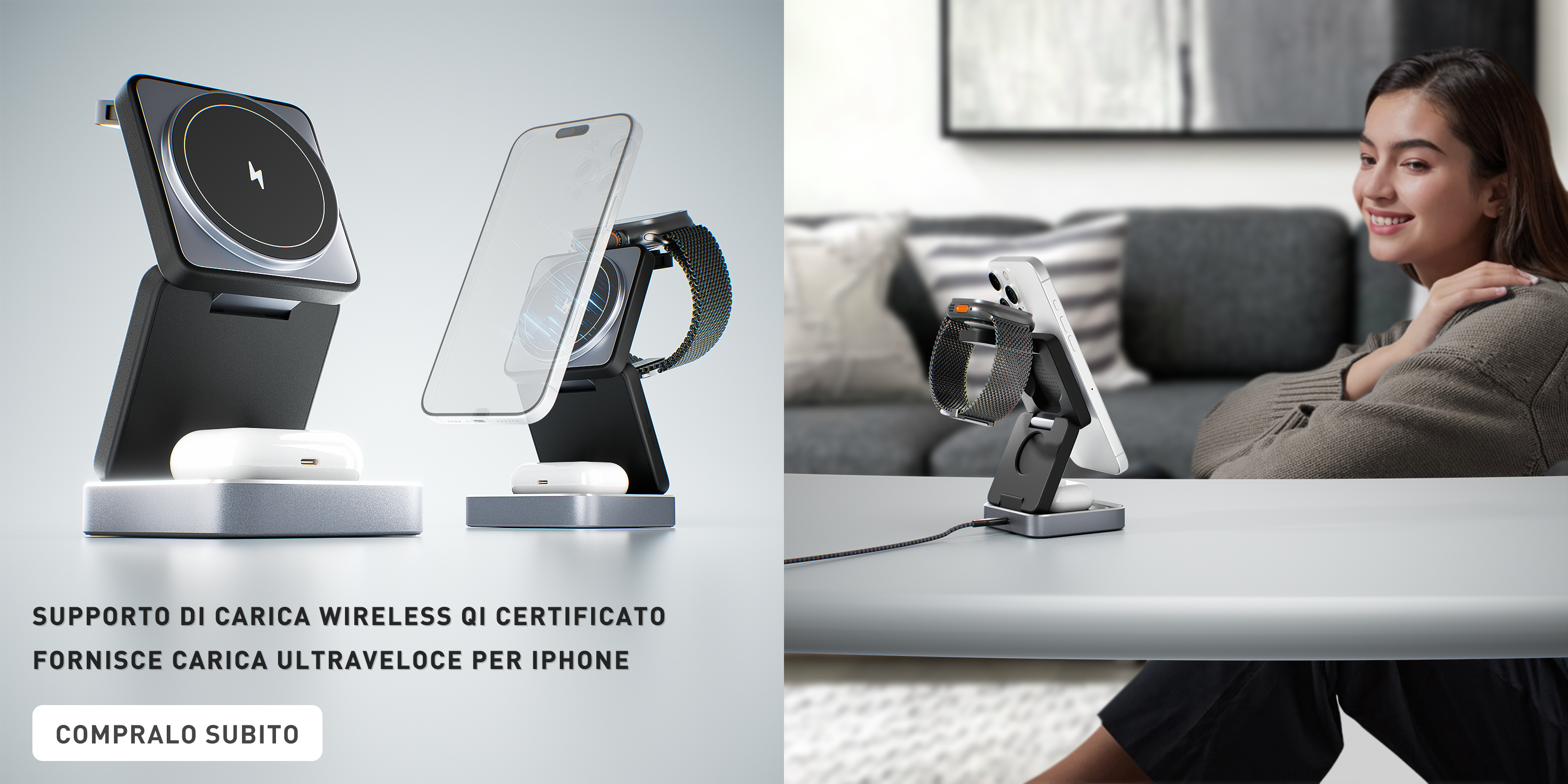 MagSafe da 15W per la ricarica rapida di smartphone, smartwatch e auricolari! Questa stazione di ricarica wireless compatta e pieghevole è ideale per aumentare la produttività in ufficio, a casa o in viaggio. Perfetta per iPhone, Apple Watch e altro ancora, garantisce che i tuoi dispositivi rimangano carichi e pronti all'azione.